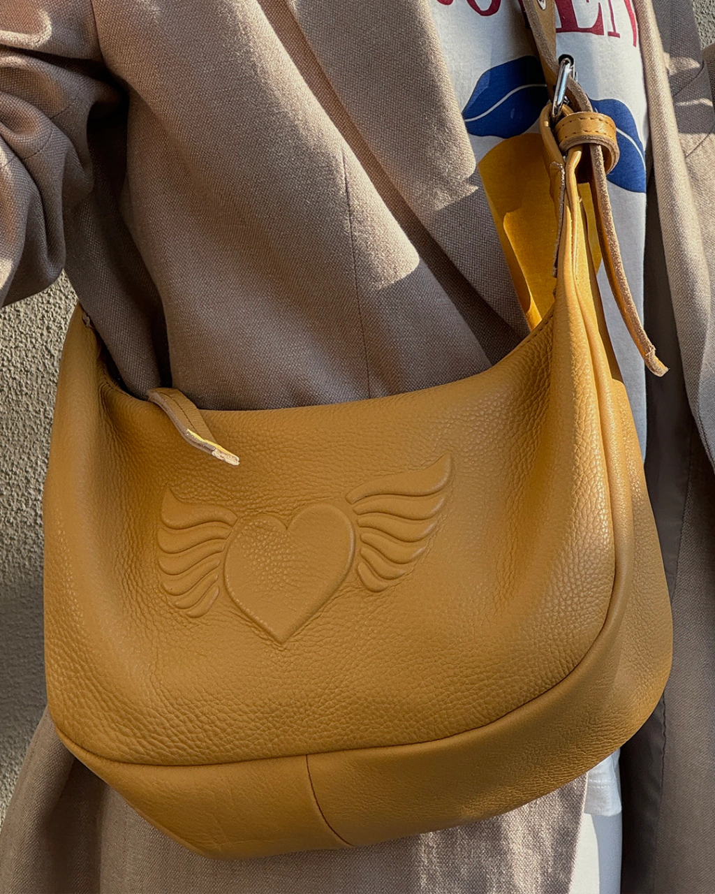 La correa de cuero es regulable, permitiendo llevarla cruzada o al hombro.