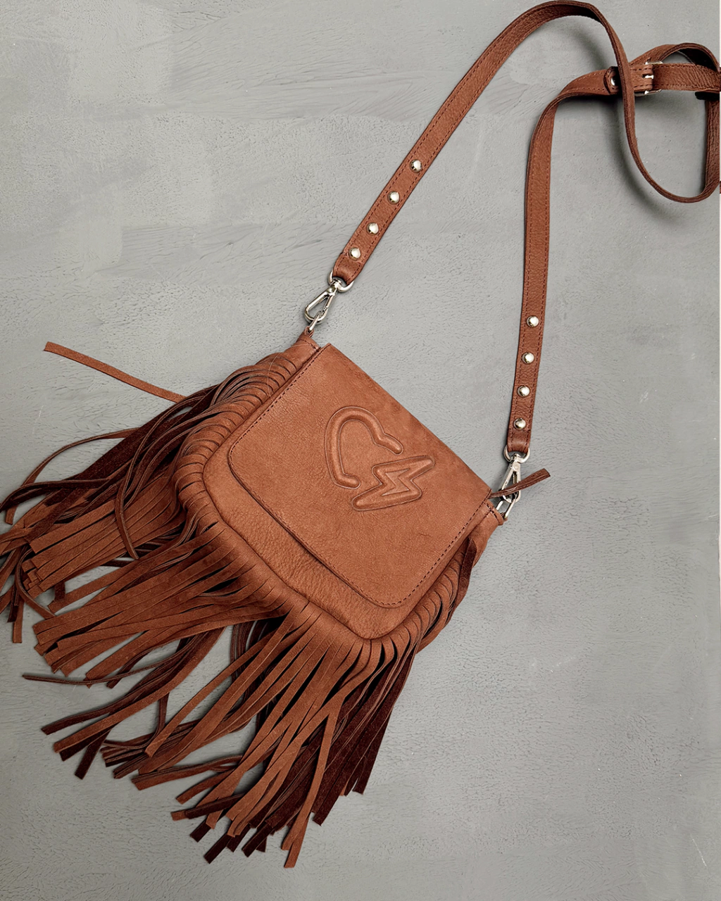 Confeccionada en cuero gamuzado 100% vacuno con estampa gofrada, esta bandolera combina funcionalidad y diseño.