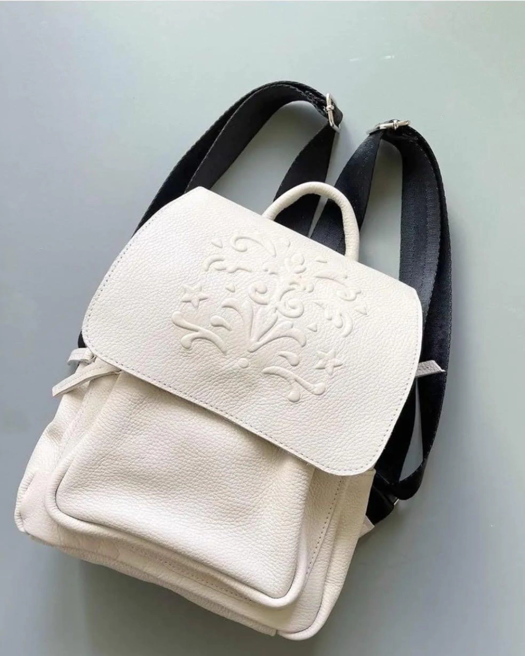 Mochila confeccionada en Cuero vacuno 100%. Estampa mediante gofrado. Posee 2 bolsillos con cierre en la parte del frente y un bolsillo trasero tambíen con cierre. Su interior esta forrado y posee 2 bolsillos. Correas de Ribbon. Medidas: 30cm de alto x 26 de ancho x 8 cm de fuelle. Al ser un cuero rústico, puede presentar pequeñas marcas en la superficie, que son propias del proceso en curtiembre.