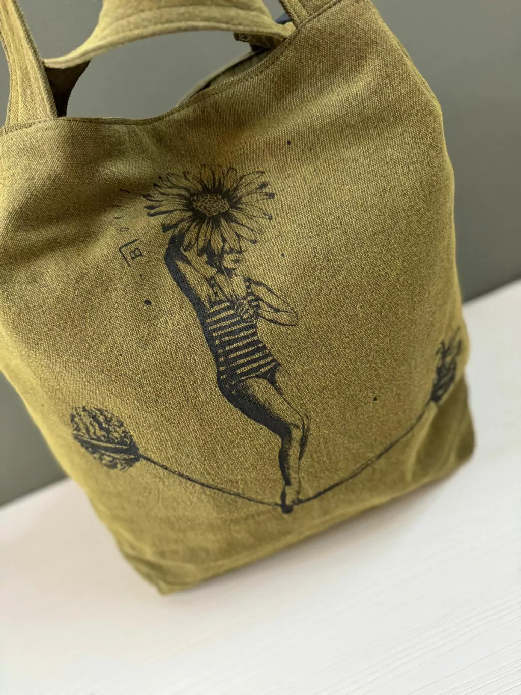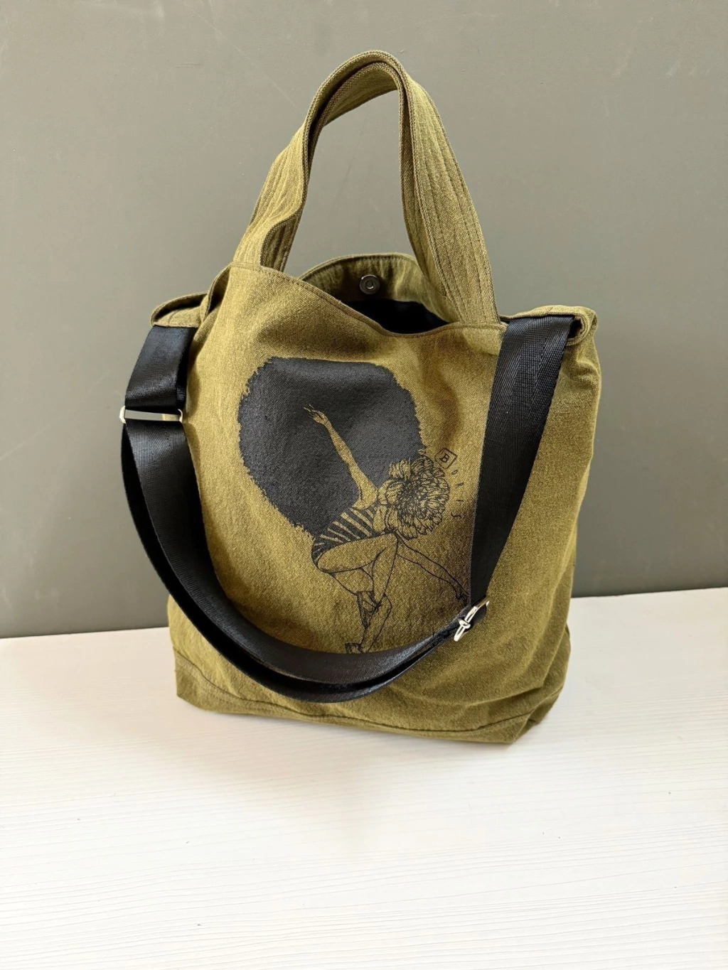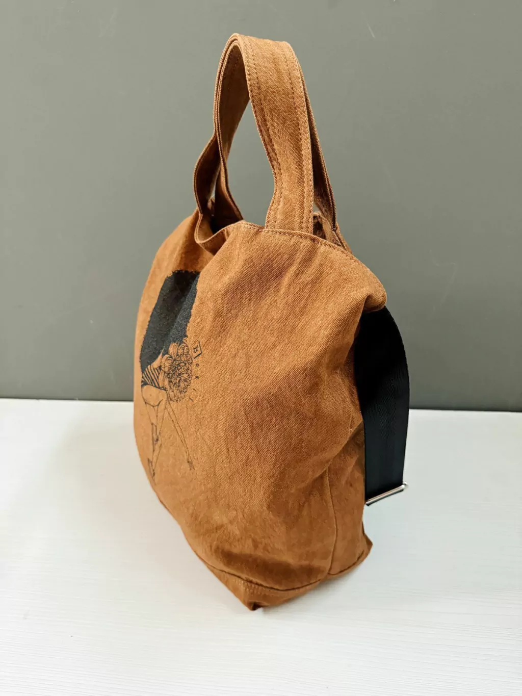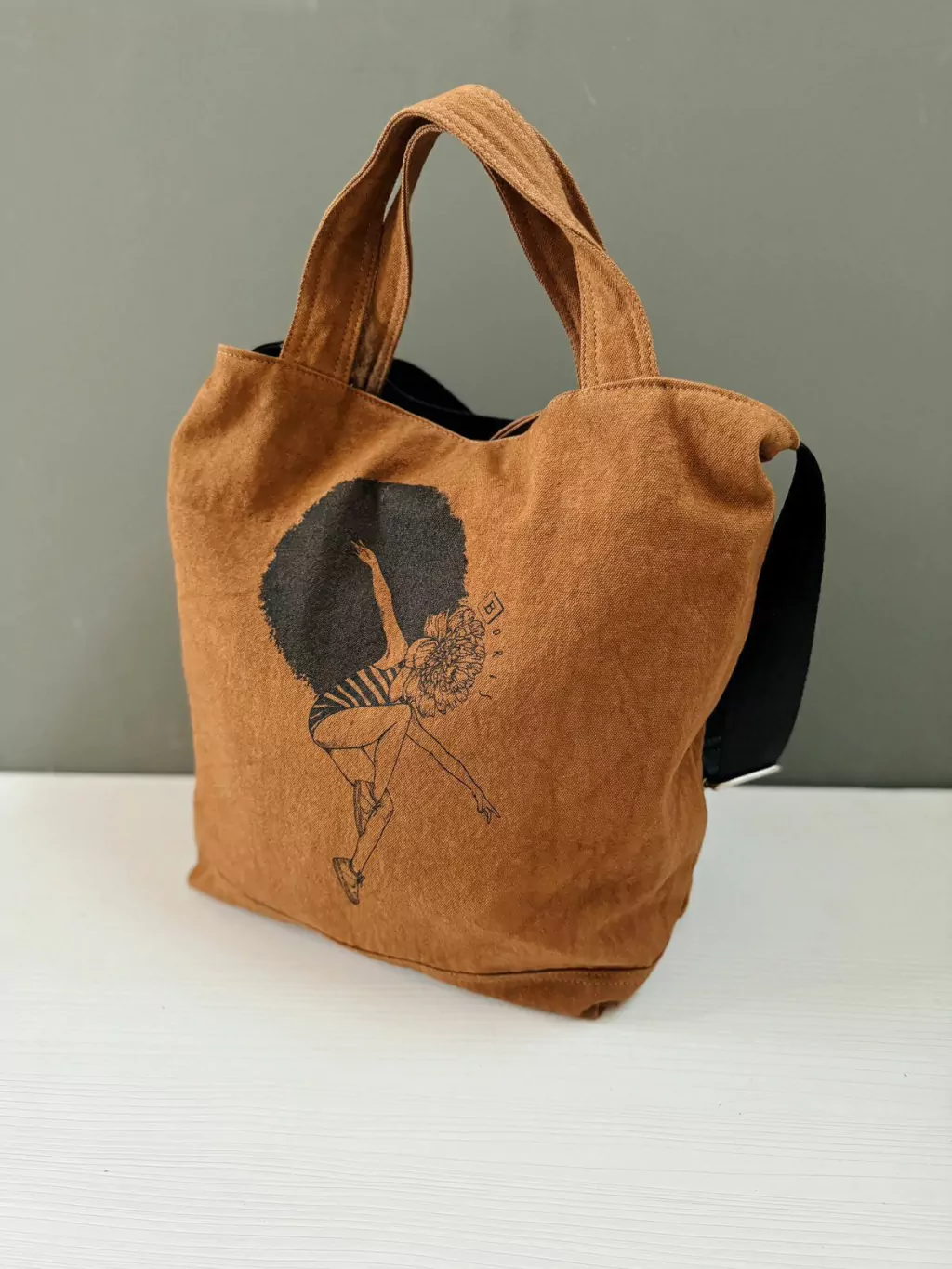 Tote confeccionado en canva (lona de algodon). Estampa mediante serigrafía. Su interior está forrado y posee un bolsillo con cierre y otro aplicado. Medidas del bolso plano: 40 cm de alto x 44 de ancho x 15 cm de base. Se cierra mediante broche imán. Correa corta de mano y correa larga regulable de ribbon.