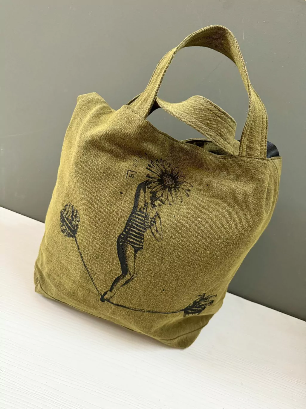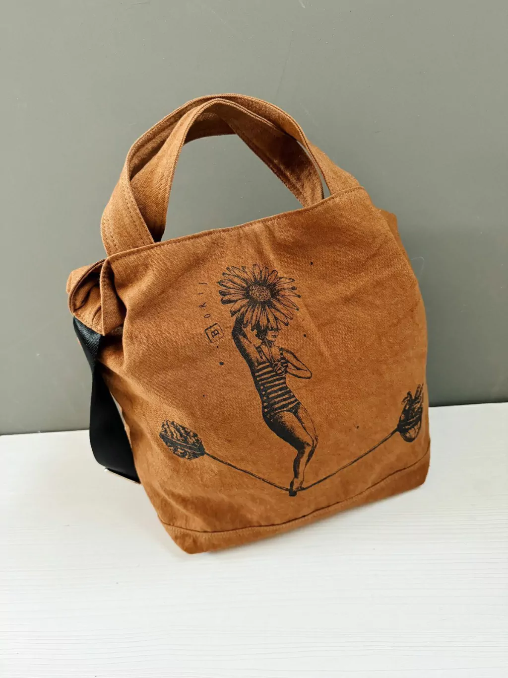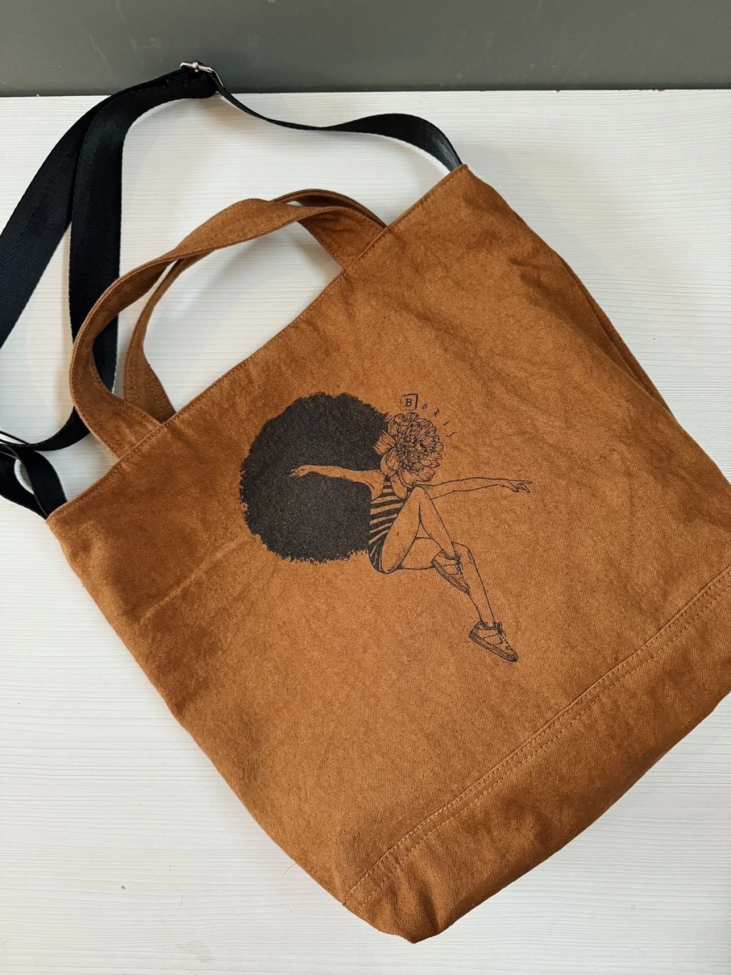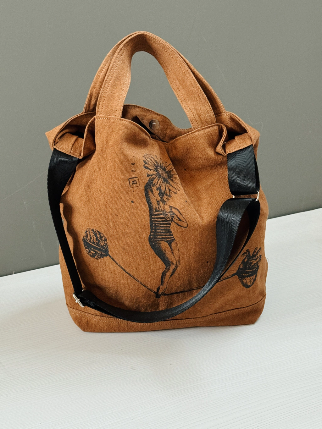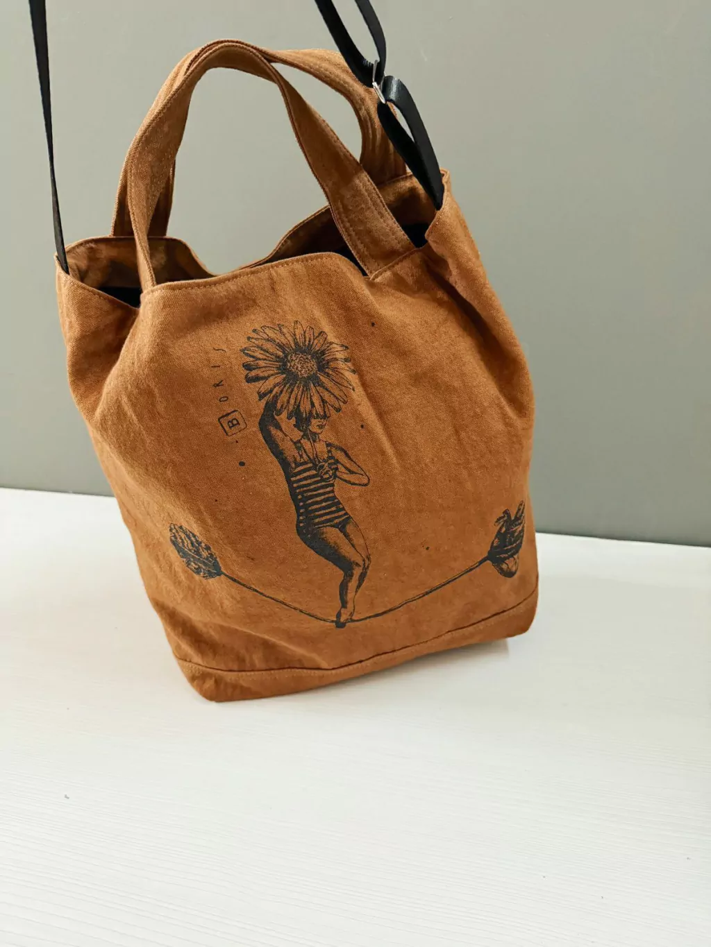 Tote confeccionado en canva (lona de algodon). Estampa mediante serigrafía. Su interior está forrado y posee un bolsillo con cierre y otro aplicado. Medidas del bolso plano: 40 cm de alto x 44 de ancho x 15 cm de base. Se cierra mediante broche imán. Correa corta de mano y correa larga regulable de ribbon.