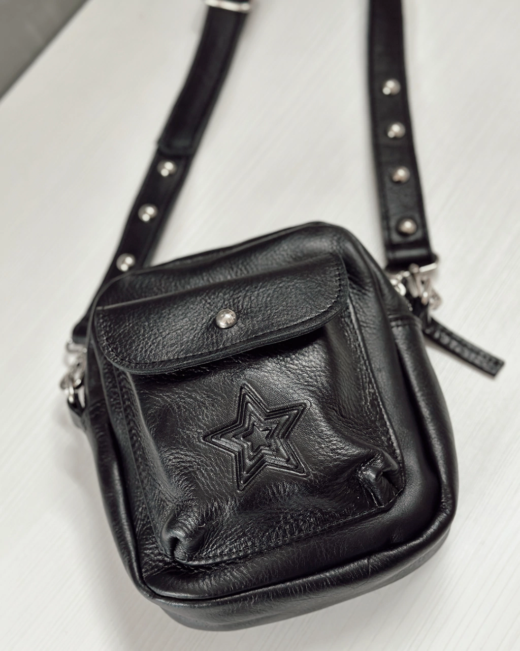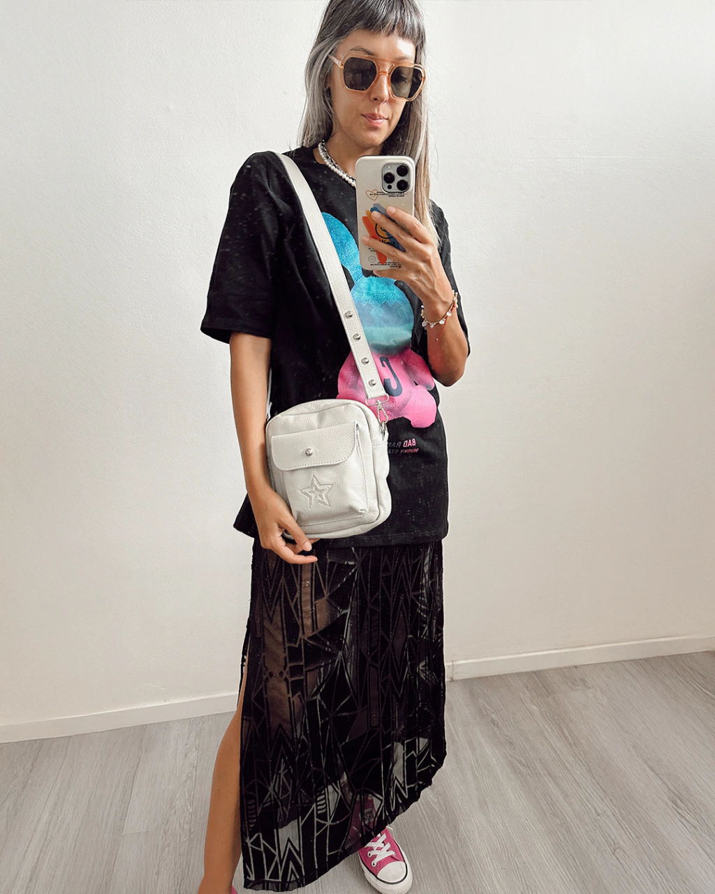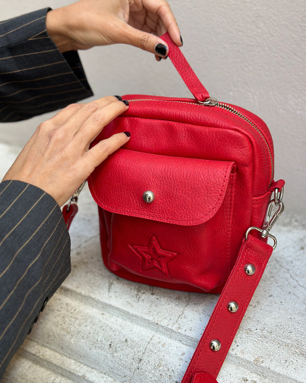 Baúl confeccionado en cuero vacuno 100%. Estampa mediante gofrado. Posee 1 bolsillo con cierre en la parte trasera. Su interior esta forrado y posee un bolsillo aplicado. Medidas: 20 cm de alto x 18 de ancho x 6 cm de base. Posee correa regulable.